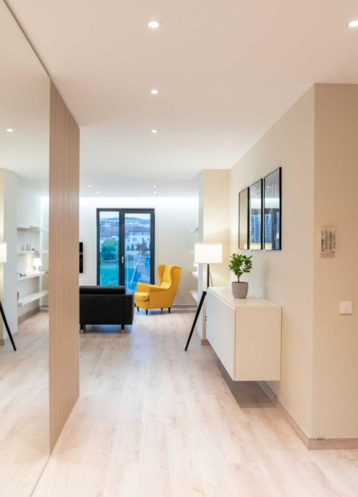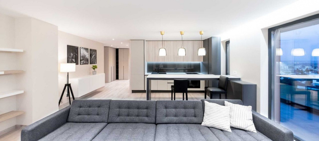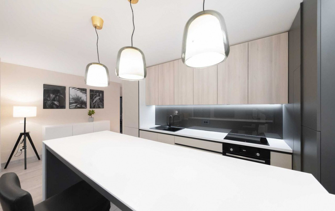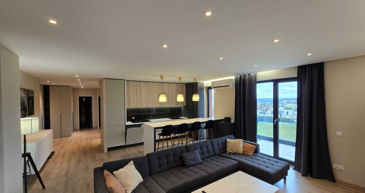 Apartamentul este finisat modern si complet mobilat/utilat, compartimentat astfel: 2 dormitoare, living, bucatarie, 2 bai, hol si terasa.