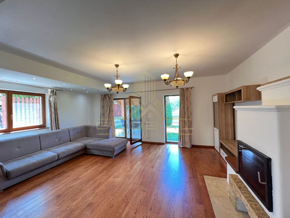 Parter: living generos cu șemineu, bucătărie + loc de luat masa, baie, hol spațios, dressing, terasă, garaj, beci